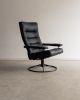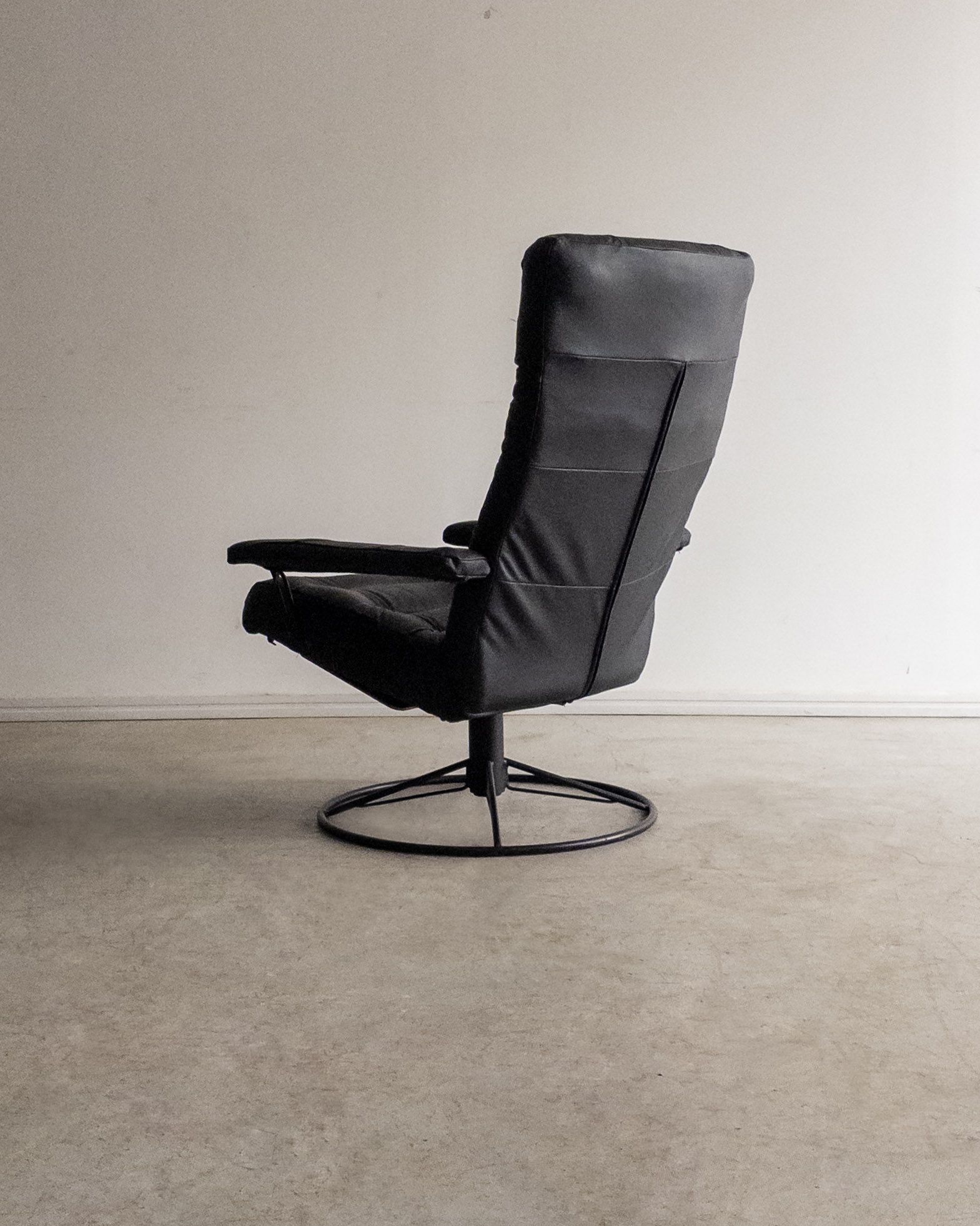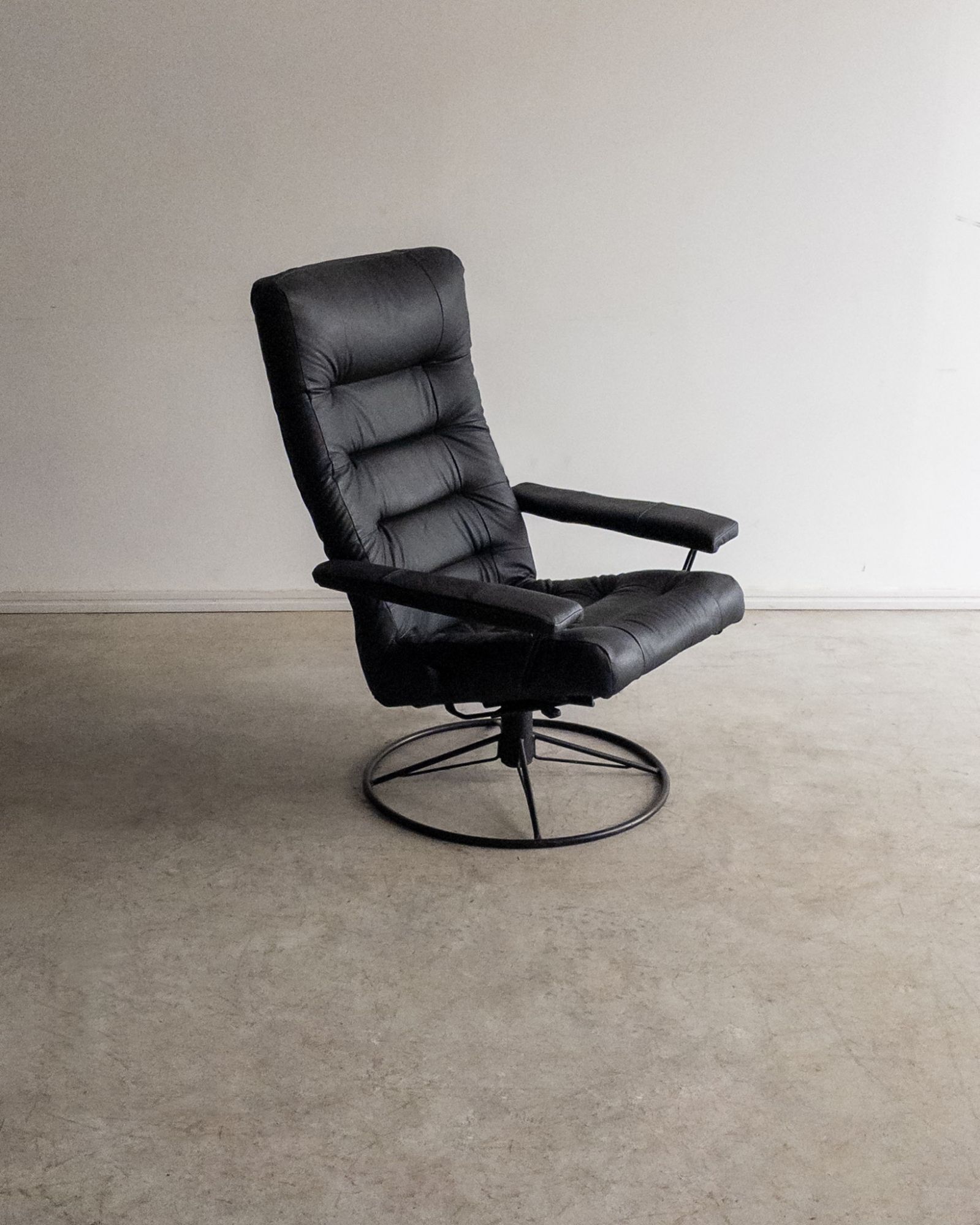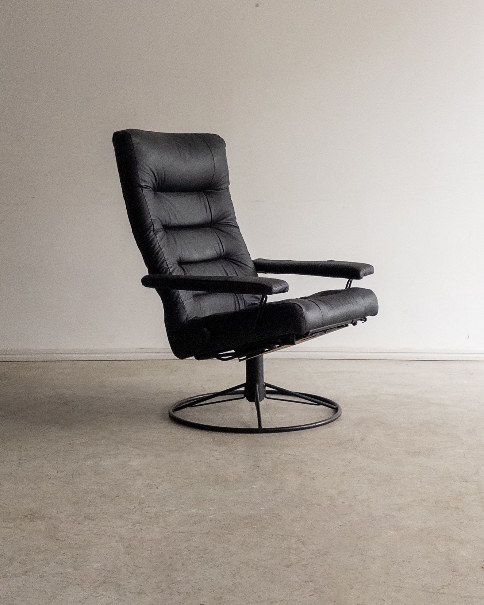 Com estrutura mecânica precisa e giro fluido, a poltrona de Percival Lafer revela o interesse do designer por soluções técnicas aplicadas ao conforto. A base metálica sustenta o sistema reclinável, enquanto o estofado organiza o volume generoso do assento e do encosto.