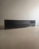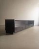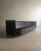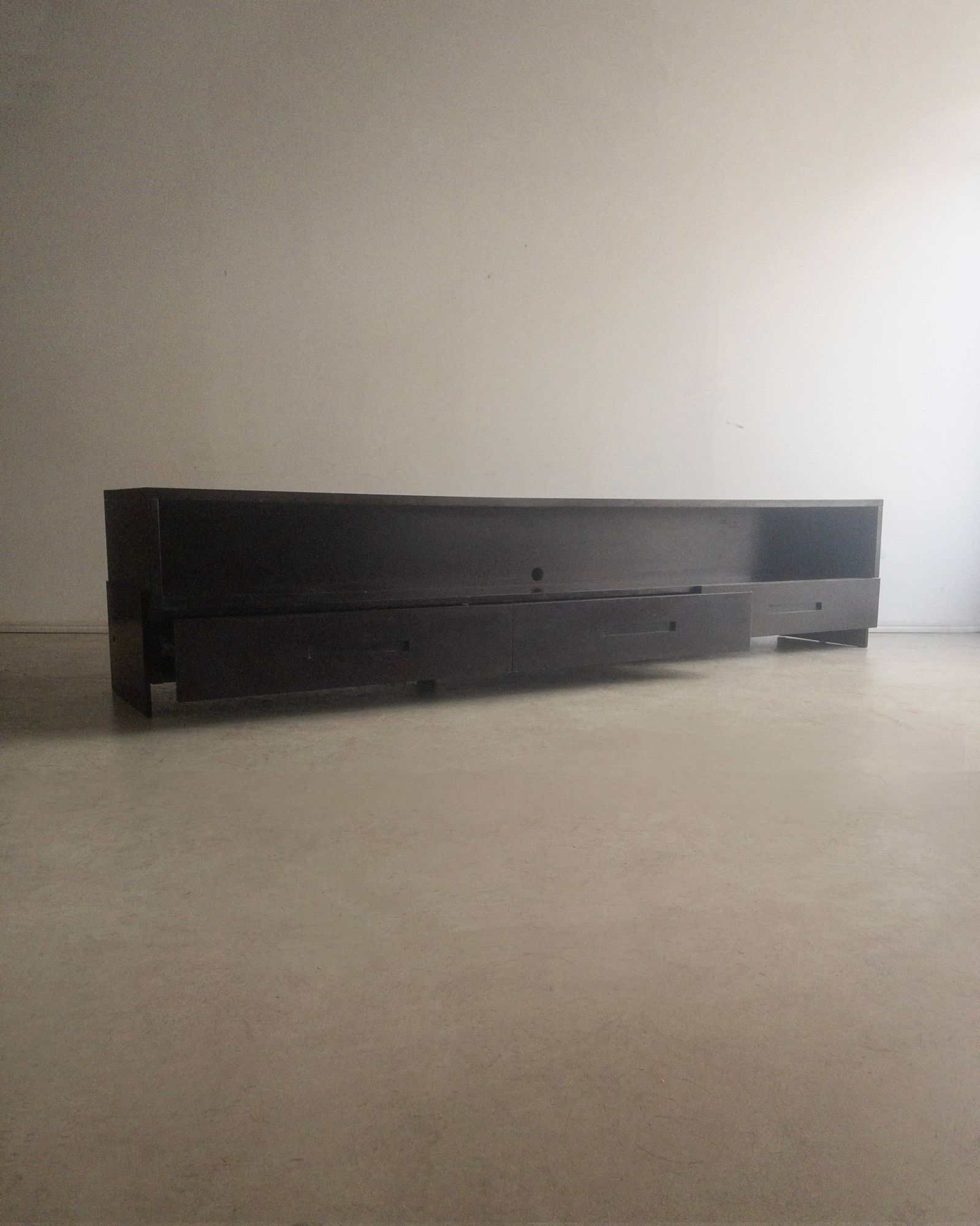 Rack com estrutura em madeira ebanizada e frente com gavetas embutidas. Design bem resolvido, da linha Casas Edições de Design. Pode apresentar leves marcas do tempo.