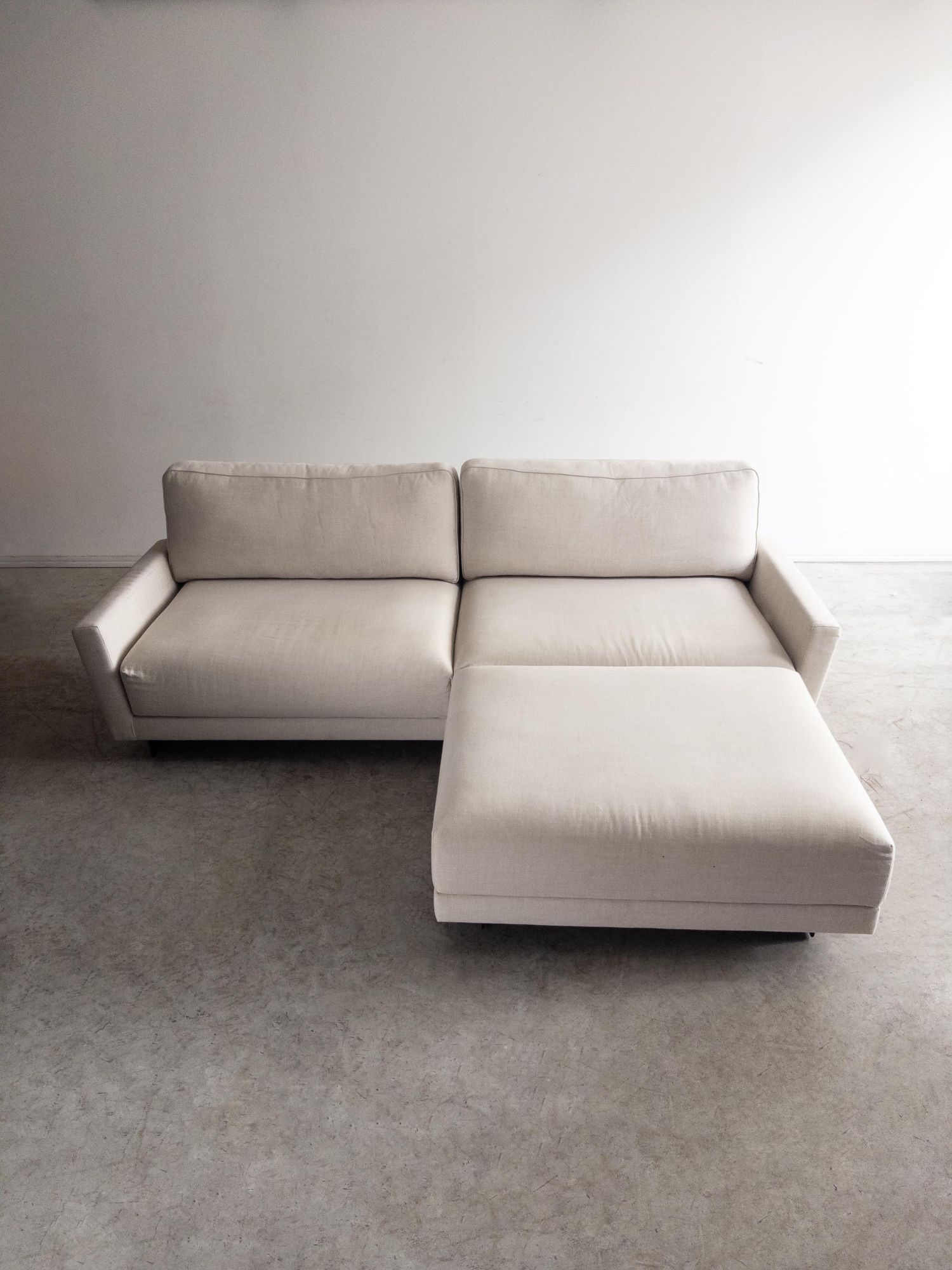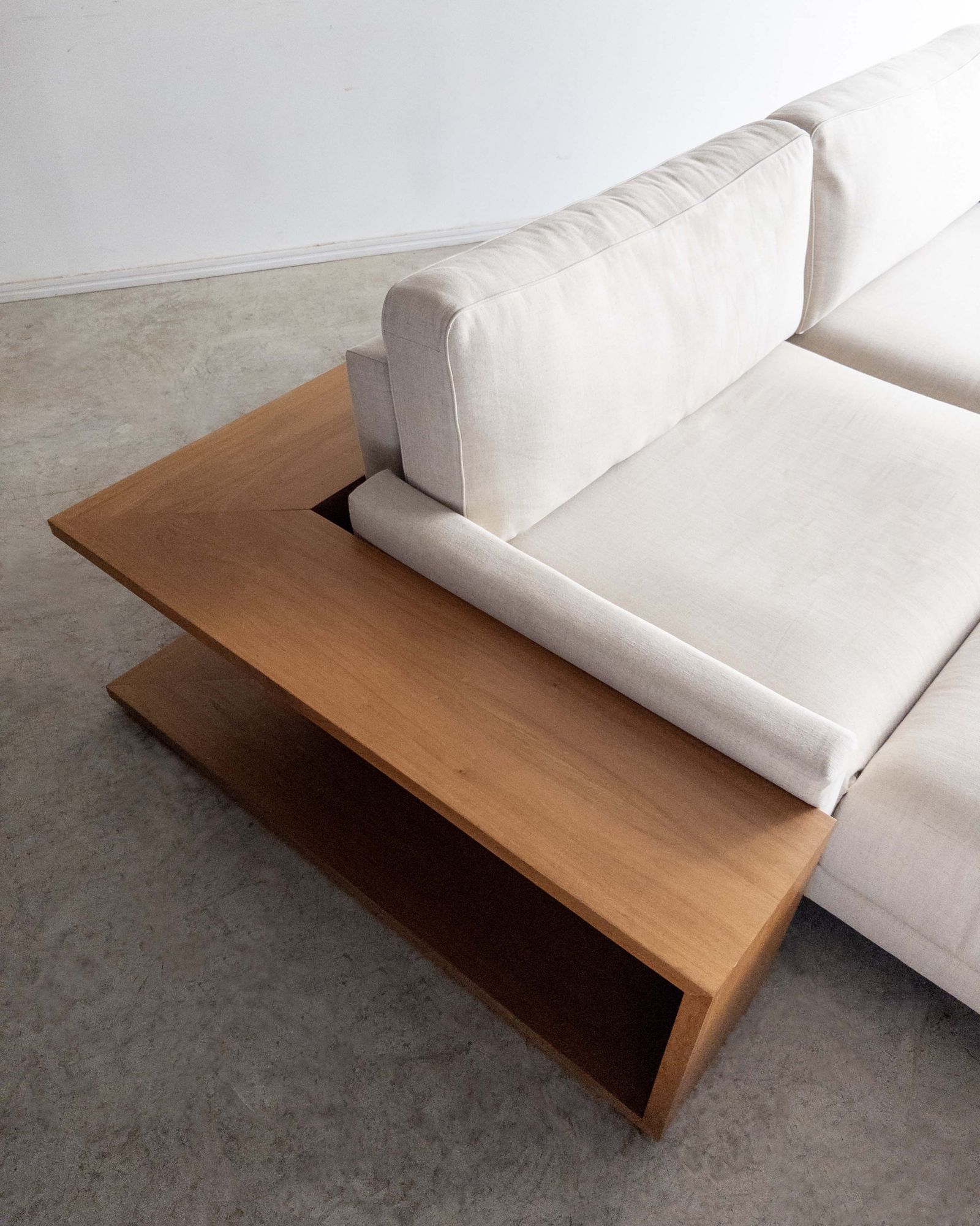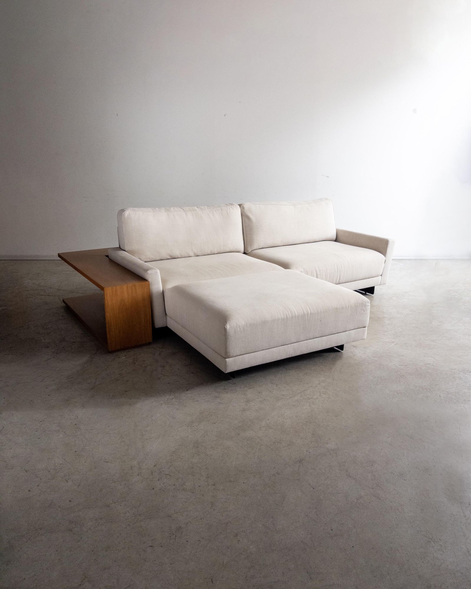 Conjunto composto por sofá estofado em linho, pufe independente e aparador em madeira maciça. As proporções generosas e o desenho contemporâneo privilegiam conforto e versatilidade, criando uma composição completa para ambientes de estar. Pode apresentar leves marcas do tempo.