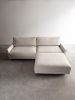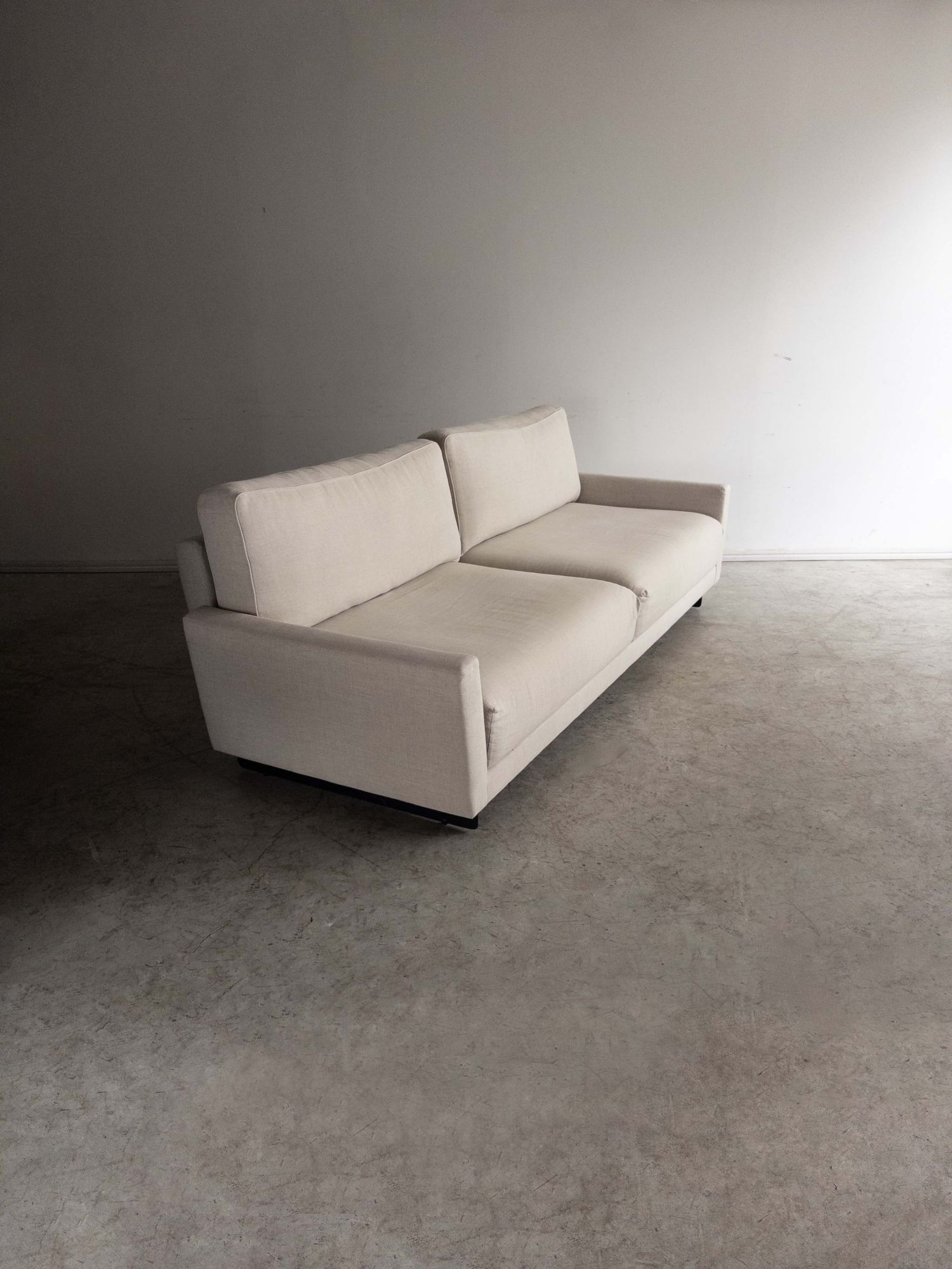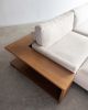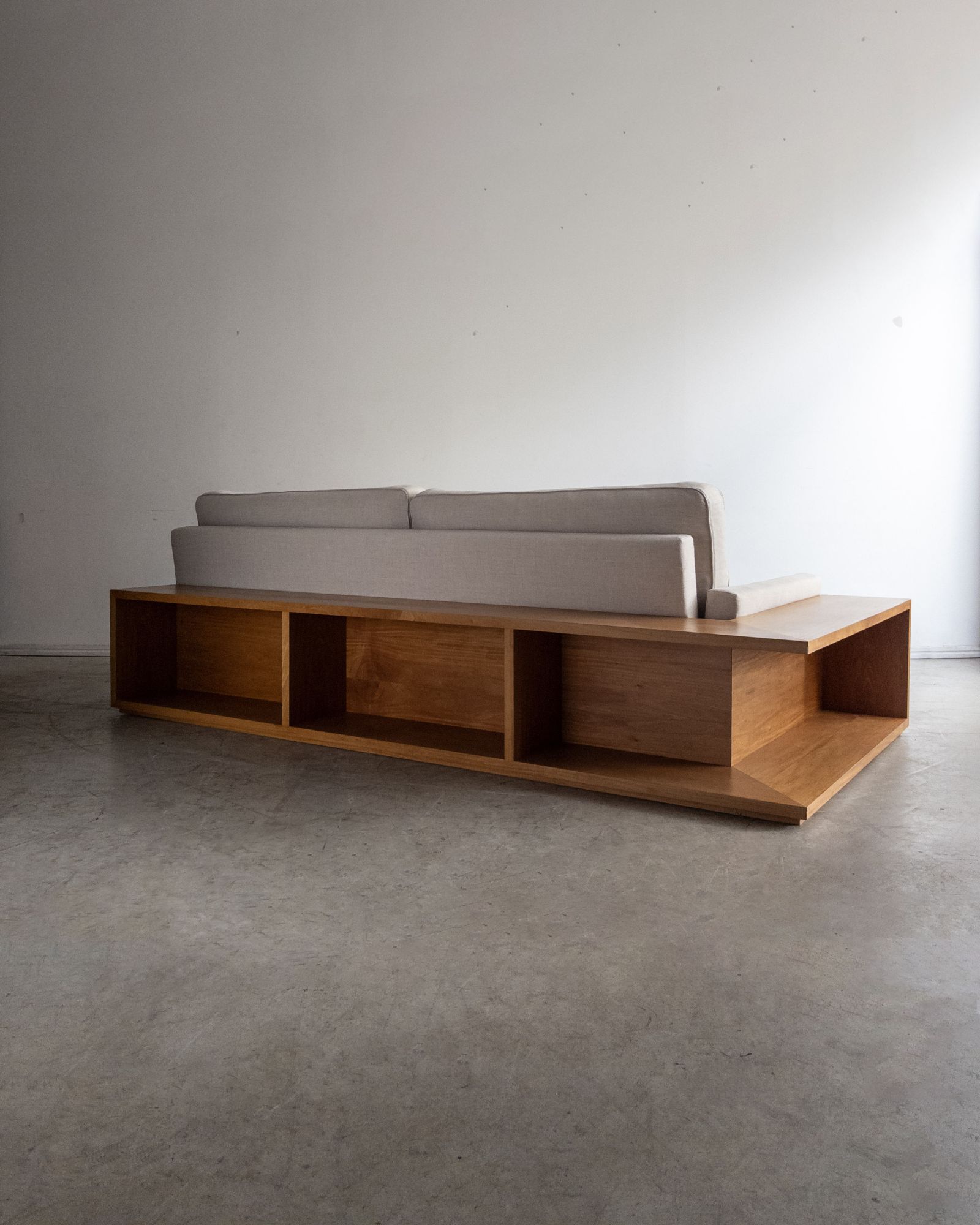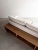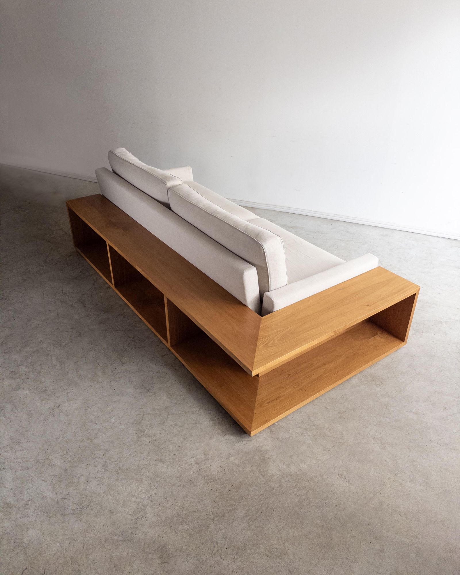 Conjunto composto por sofá estofado em linho, pufe independente e aparador em madeira maciça. As proporções generosas e o desenho contemporâneo privilegiam conforto e versatilidade, criando uma composição completa para ambientes de estar. Pode apresentar leves marcas do tempo.