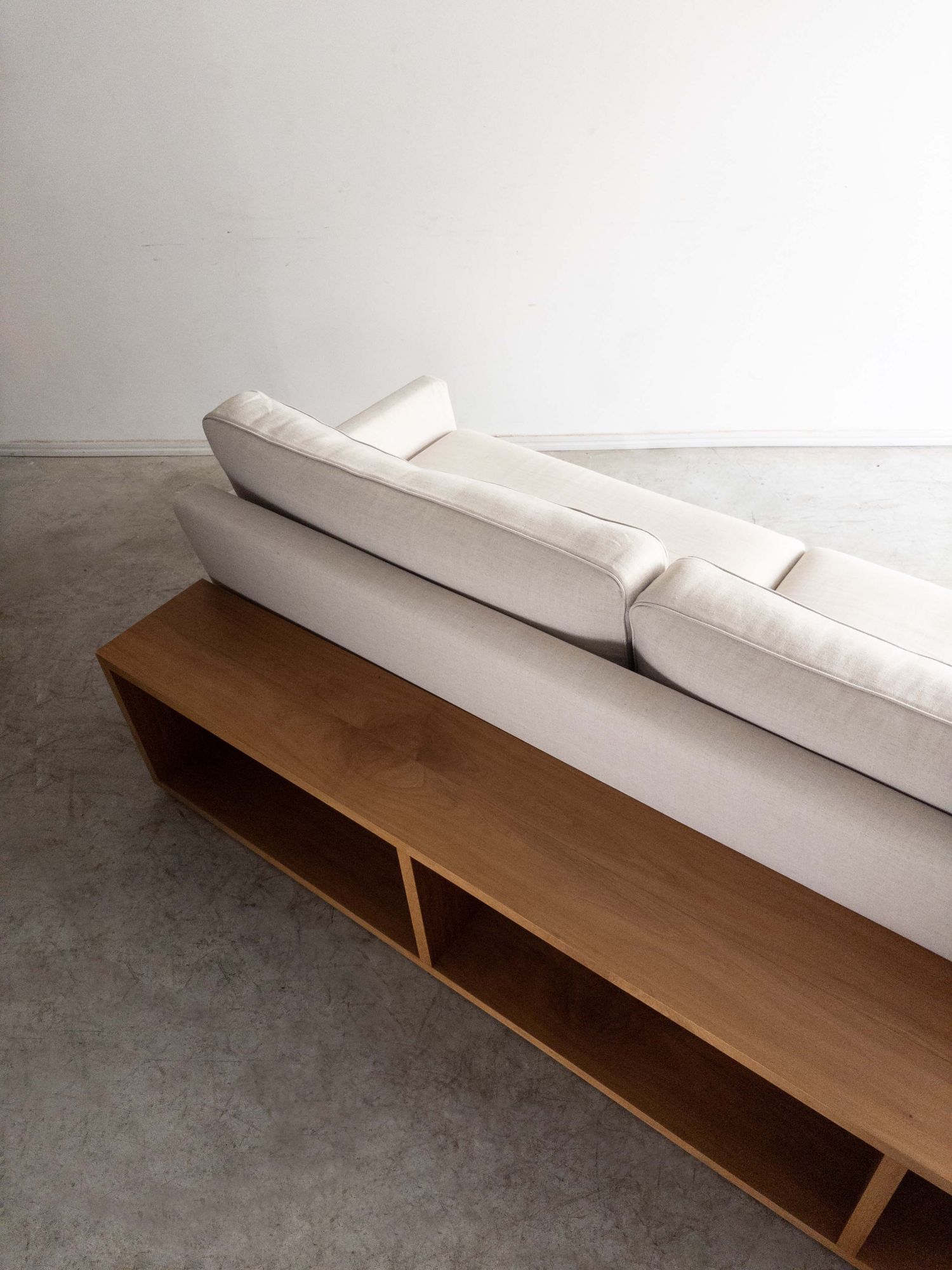 Técnica: Estrutura estofada em linho, aparador em madeira maciça